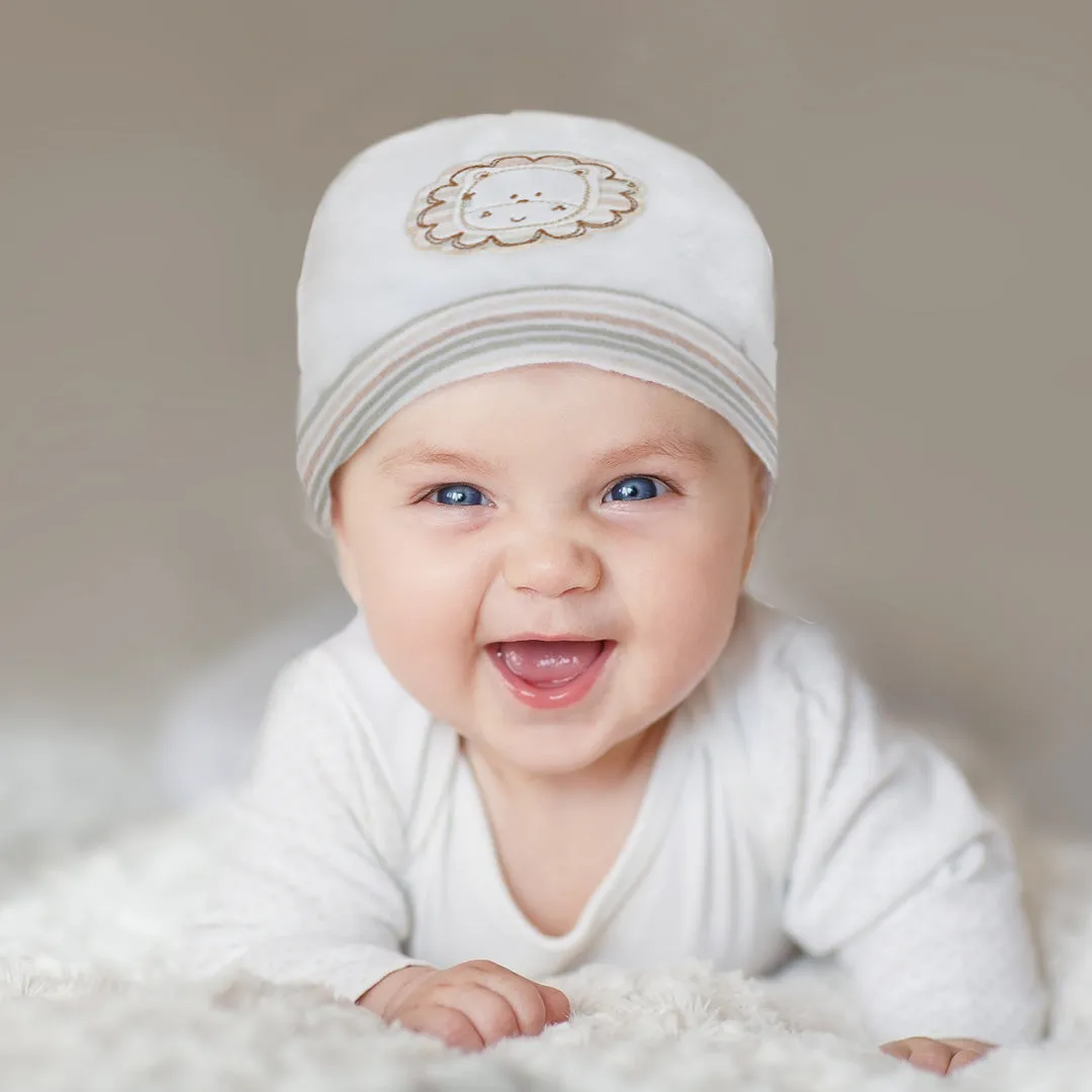 > 100% cotton beanie, fully lined and in neutral colours - perfect for delicate newborns.